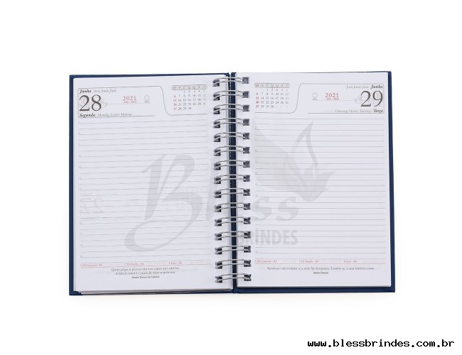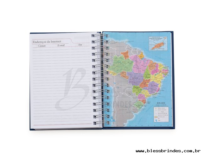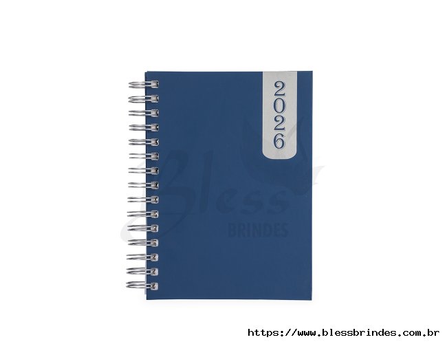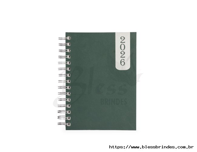 Agenda diária wire-o com capa produzida em prime, frente e verso liso, apenas com detalhe do ano ‘2026’ na parte superior direita. Contém “bolso” plástico atrás da capa, dados pessoais, mapa do Brasil, mapa global, índice telefônico e planejamento