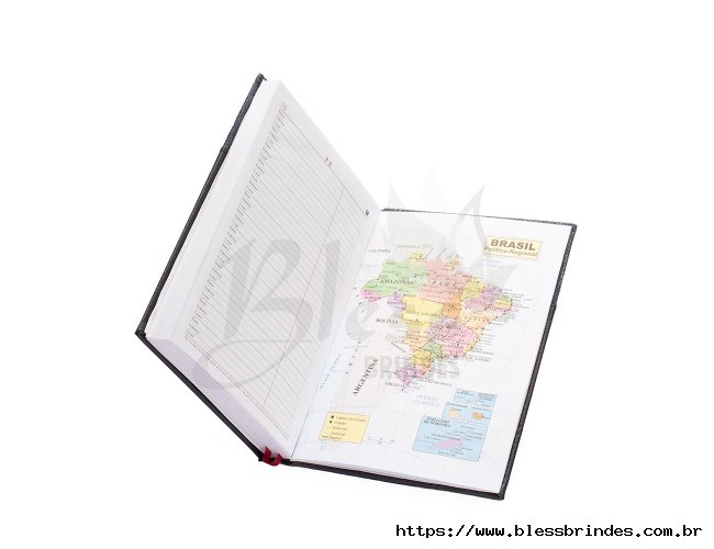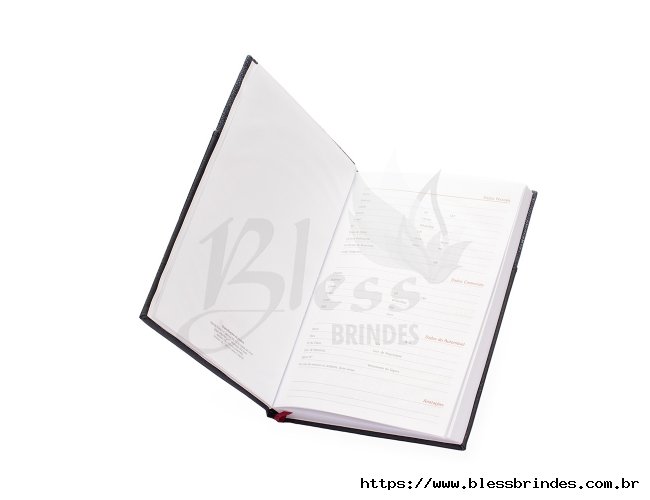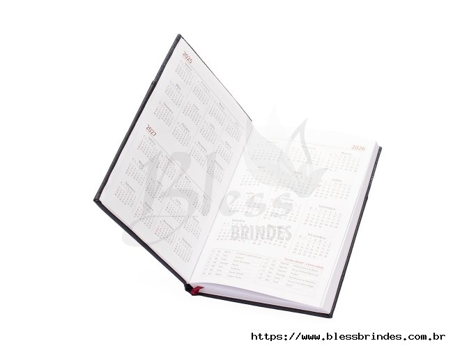 Agenda 2026 com capa dura em poliuretano (PU) e marcador de páginas em cetim. Possui páginas dedicadas a dados pessoais, calendários de 2026 a 2028, lista de contatos e itens de conversão de unidades de medidas, códigos DDD e DDI e mapas.