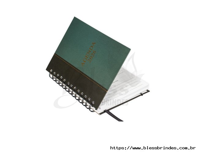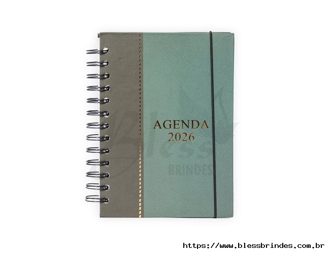 Agenda diária com capa dura, encadernação Wire-O, marca-páginas em cetim e elástico para fechamento. Contém ainda páginas dedicadas a dados pessoais, calendários de 2026 a 2028, planejamento mensal e lista de contatos.