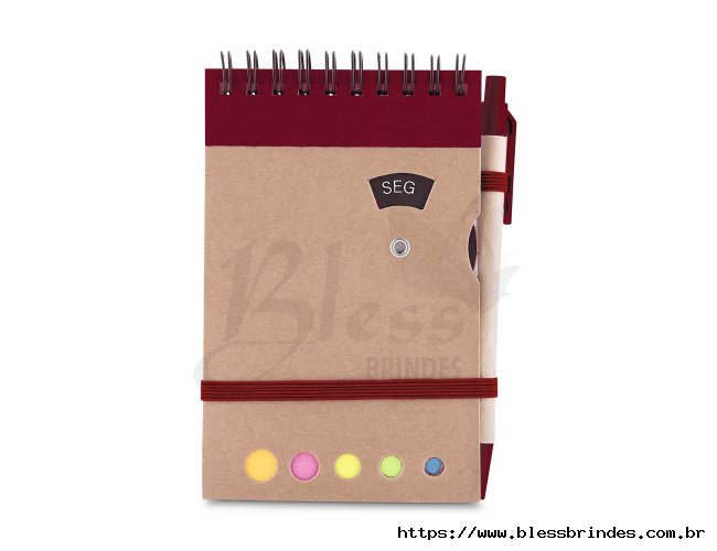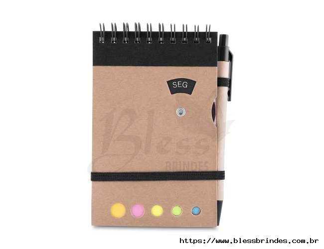 Bloco de anotações com capa em kraft, encadernação Wire-O, porta-caneta e fechamento em elástico, além de disco rotativo com os dias da semana. Inclui cerca de 70 folhas pautadas e cinco blocos de marcadores coloridos autocolantes, com 26 unidades cada. Acompanha caneta esferográfica azul de 1,0 mm, com corpo em papelão, acionamento por clique e detalhes em plástico.