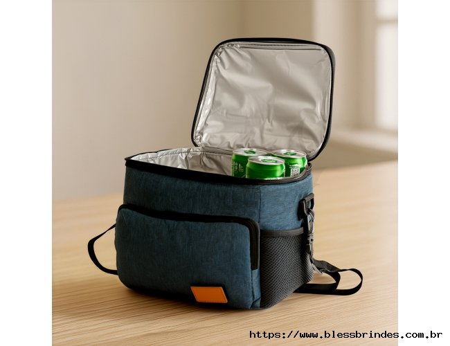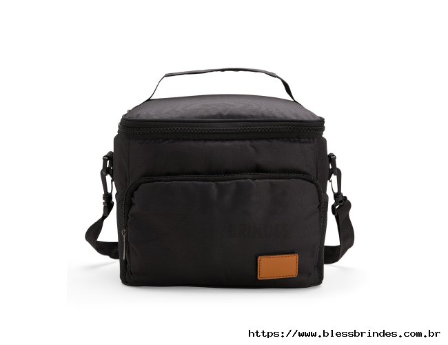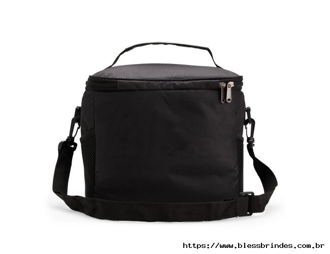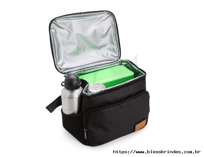 Bolsa térmica confeccionada em Oxford resistente à água, fechamento em zíper, alça de nylon na tampa e capacidade de até 11 litros. Possui revestimento térmico em PEVA atóxico, além de compartimento frontal com plaquinha de couro sintético fixada por velcro e dois bolsos laterais em tela de tecido respirável com elástico. Acompanha alça transversal removível e ajustável.