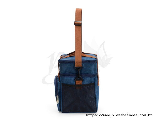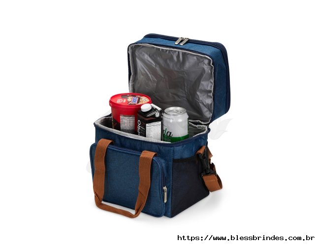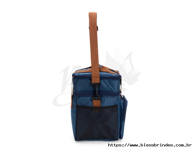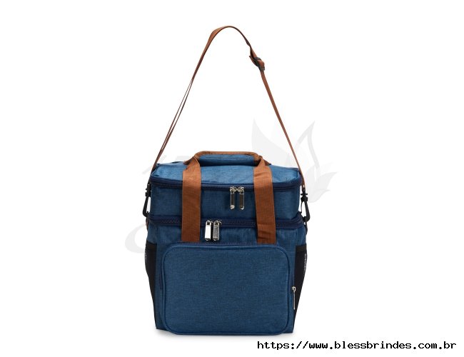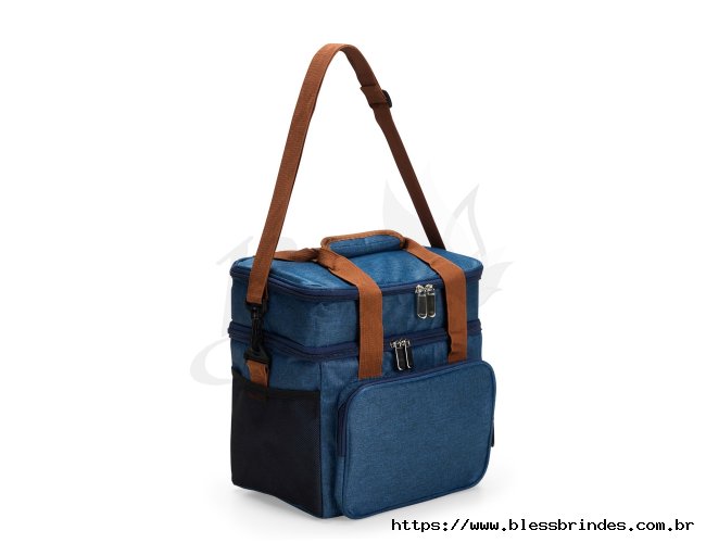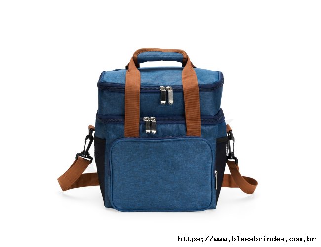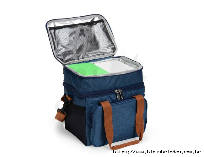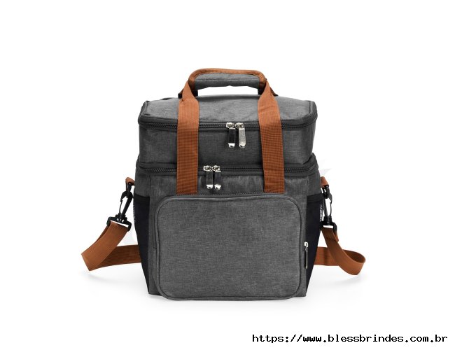 Bolsa térmica dupla em poliéster 300D resistente à água e capacidade total de 15 litros. Possui dois compartimentos térmicos: um inferior, com revestimento em PEVA soldado (não vaza) que comporta até 9 litros e outro, em alumínio, com espaço para até 3 litros.. Conta ainda com bolso frontal, bolsos laterais em tela, alças de mão com suporte de juntura e alça transversal regulável e removível.