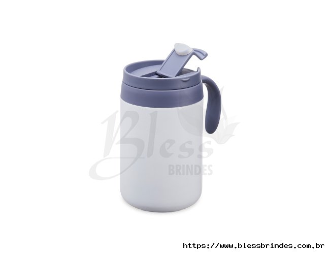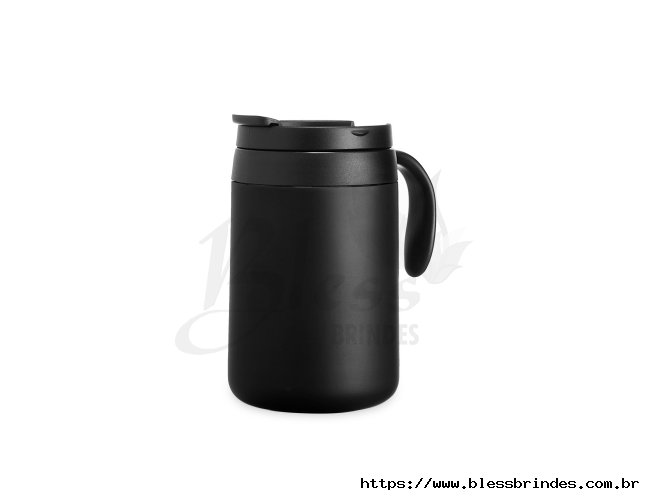 Caneca térmica feita em inox 304 com parede dupla, capacidade de 500ml. Contém tampa com acesso para o bocal, alça plástica e base antiderrapante.