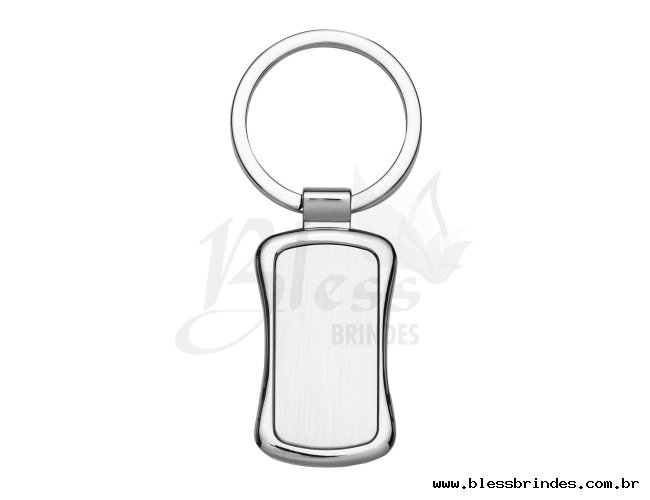 Chaveiro de metal retangular com chapa central, verso liso. Possui bordas arredondadas e laterais encurvadas.