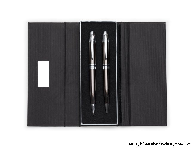Conjunto caneta e lapiseira em estojo de cartonagem com placa central para personalização. Clip metal e anel central possui: anel fino prata, anel preto fino e um anel maior prata com relevo e acionam por giro. Estojo revestida com espuma na parte interna.