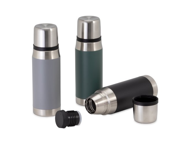 Descrição: Garrafa térmica 1L em inox com tampa rosqueável, tampa interna em plástico resistente(basta um clique para abrir ou fechar). Acompanha capa protetora de couro sintético com alça em nylon e detalhe vermelho.