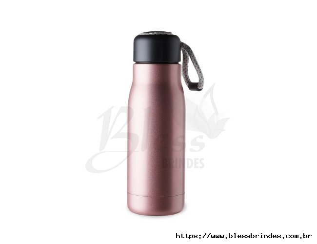 Garrafa térmica com capacidade de 420ml feita em inox 304 com parede dupla. Tampa plástica com corda para transporte embutida.