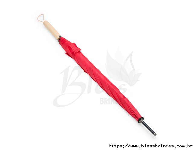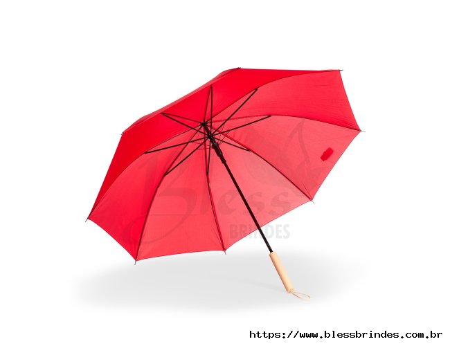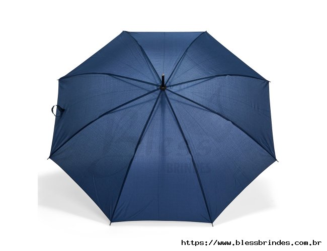 Guarda-chuva com abertura automática, estrutura em aço e 8 varetas em fibra de vidro. Possui pegador de madeira com alça de nylon e botão de acionamento.