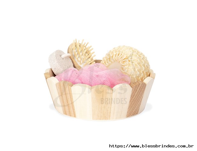 Kit banho com estilo natural envolvido em um cesto de madeira. Contém 4 itens: escova de madeira com cerdas macias, pedra-pomes, esponja redonda e uma esponja de nylon.