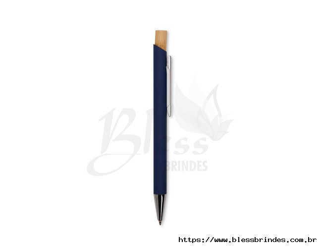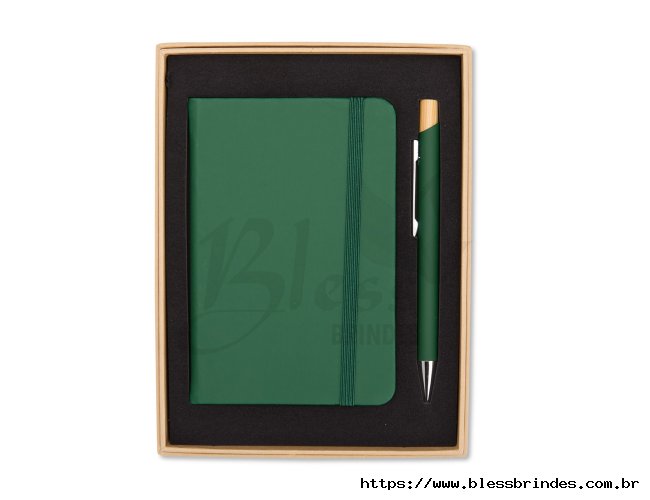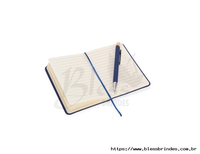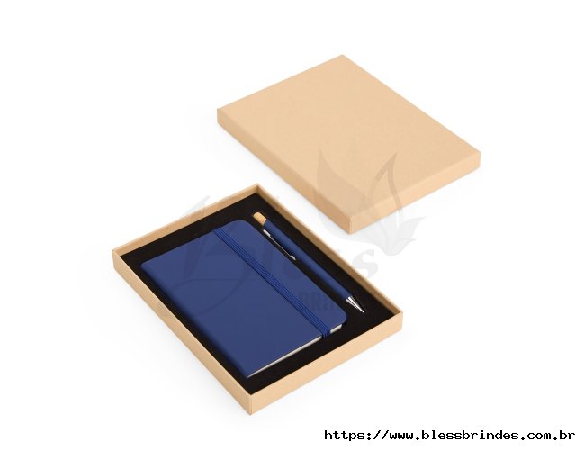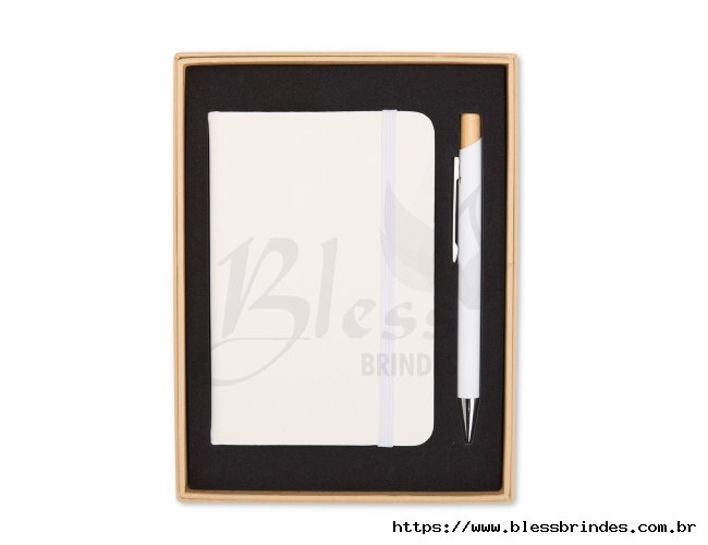 Kit executivo composto por uma caderneta e uma caneta. A caderneta possui capa dura em couro sintético, marca-páginas em fita de cetim e elástico para fechamento, além de aproximadamente 80 folhas com pauta. Por sua vez, a caneta metálica conta com detalhe em bambu, acionamento por clique e carga esferográfica azul de 1,0mm. Acompanha uma caixa de papelão com berço interno em espuma.