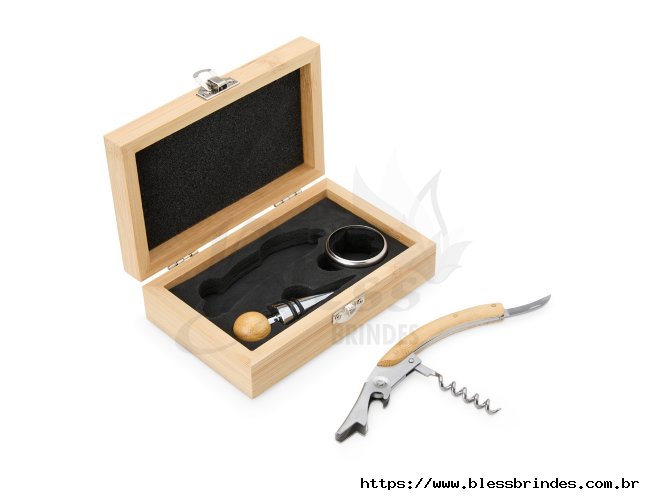 O kit vinho com 3 peças com estojo de bambu é a escolha perfeita para quem busca elegância e funcionalidade. Acompanha um saca-rolhas metálico com acabamento em bambu, que possui lâmina de corte e abridor de garrafa, uma tampa de bico com detalhe em bambu e silicone, e um wine collar. A caixa de bambu tem um design sofisticado e rústico, e contém ainda um berço de espuma interno, garantindo a proteção dos itens.