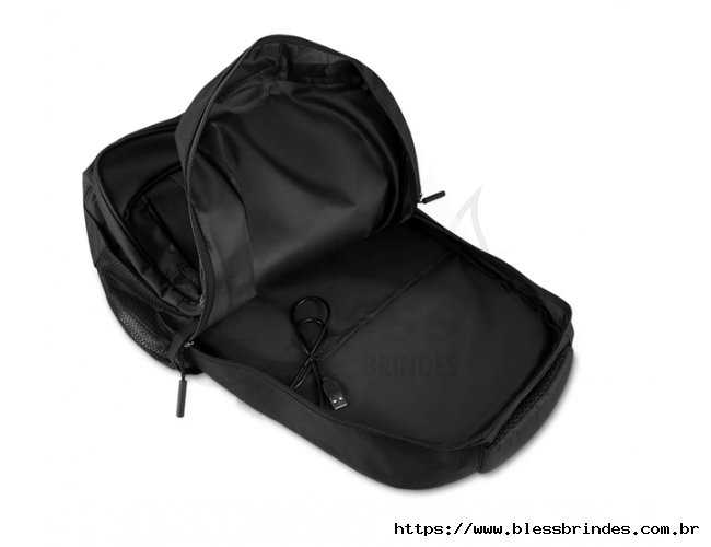 Mochila confeccionada em tecido externo de poliéster 300D e tecido interno de poliéster 190D, com capacidade total de 23 litros. Possui três bolsos frontais com zíper, compartimento principal com fechamento em zíper, dois bolsos laterais e engate para mala de viagem. Conta ainda com compartimento interno próprio para notebooks de até 15,6 polegadas.