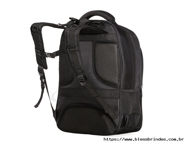 Mochila de poliéster 42 litros com três compartimentos, sendo o principal com bolso para notebook 156. Com divisórias internas para acessórios, a mochila possui bolsos laterais em malha, alça para encaixe em malas de viagem, alças de compensação, duas alças de mãos e área costada com revestimento espumado. Acompanha plaquinha metálica.