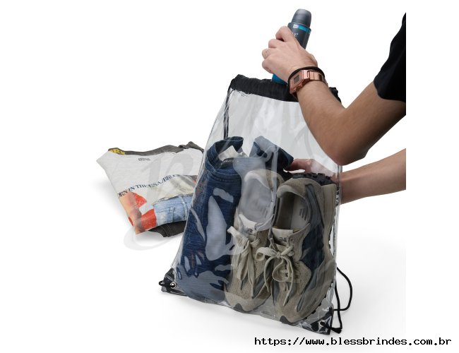 Mochila Saco em PVC transparente com detalhes em tecido nylon, alças reguláveis e dois ilhós metálicos.