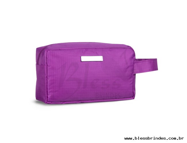 Descrição: Necessaire de pvc colorido plaquinha metálica para personalização, possui alça lateral, zíper e forro de poliéster.