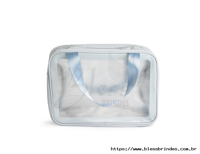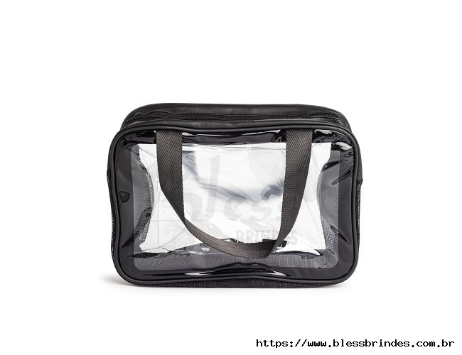 Nécessaire de PVC e PU com duas divisórias, uma delas em malha respirável, e duas alças laterais para facilitar o transporte.