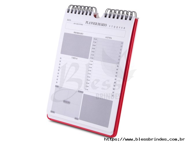 Planner diário com capa dura em PU, encadernação em Wire-O e gancho metálico superior. Possui cerca de 80 folhas com seções para a anotação de prioridades, tarefas e agenda do dia.