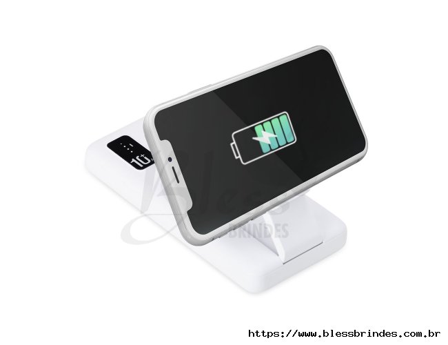 Carregador portátil plástico via indução ou via cabo com 10.000mAh e indicador led de bateria. Com suporte inclinável para o carregamento via indução, o power bank possui duas portas de saídas USB, possibilitando o carregamento de dois dispositivos simultaneamente. Contém porta de entrada tipo-C, V8 e acompanha cabo USB.