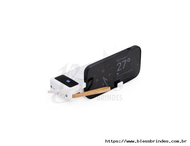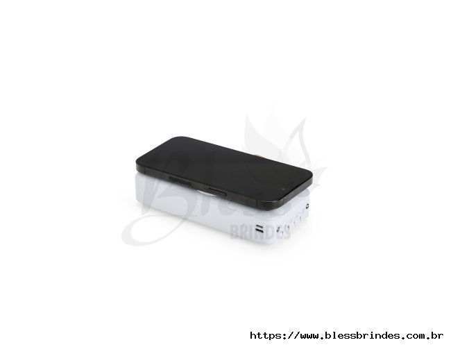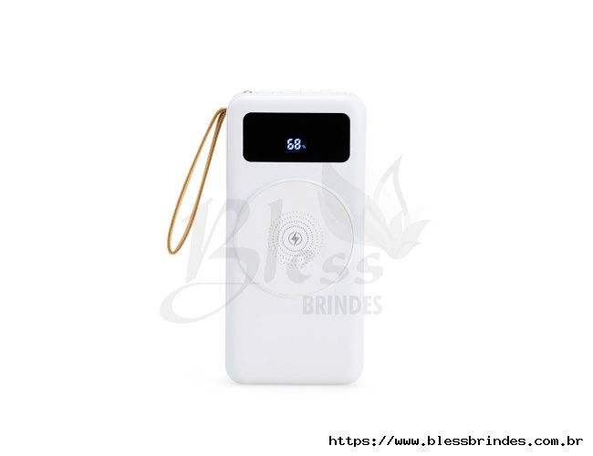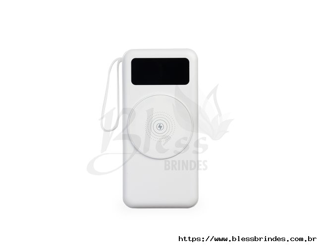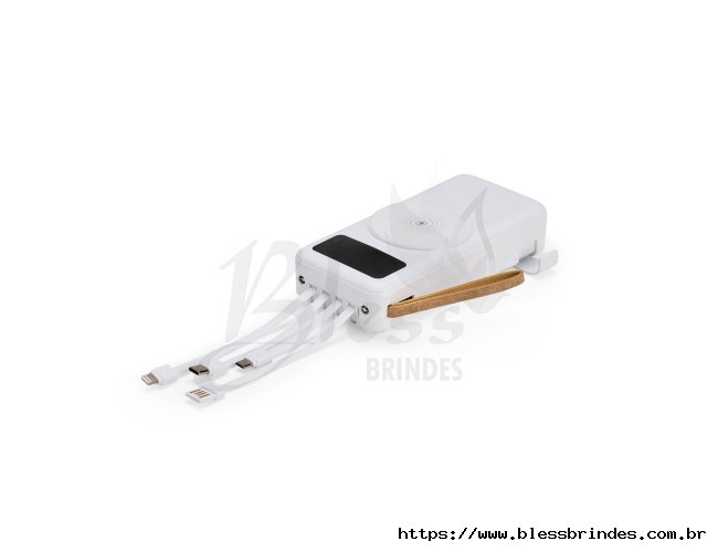 Power bank em plástico com capacidade de 20.000mAh, painel de LED que indica o percentual de bateria, alça para transporte e suporte lateral que permite apoiar aparelhos na horizontal. Possui quatro cabos acoplados, incluindo: USB-C, Micro USB, Lightning e Cabo USB, além de espaço reservado para carregamento por indução de aparelhos compatíveis. Dispõe ainda de conexões USB-C, Micro-USB e USB para recarga do próprio dispositivo.